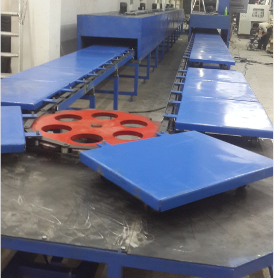 环形输送线是生产聚氨酯塑料制品的专用辅助设备,用于将发泡好的模塑产品经过输送小车自动输入到烘箱内加热熟化成型。能提高生产数量,适用于模具数量多的产品使用。